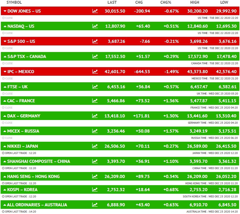 मंगलवार को अमेरिकी बाजारों में गिरावट देखने को मिली। डाउ जोंस इंडेक्स 0.67% की गिरावट के साथ 200.94 अंक नीचे 30,015.50 पर बंद हुआ था। इसी तरह S&P 500 इंडेक्स भी 7 अंक नीचे 3,687 पर बंद हुआ था। दूसरी ओर नैस्डैक इंडेक्स 65 अंक ऊपर 12,807 पर बंद हुआ था।