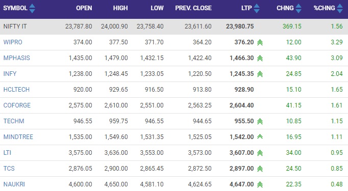 09:26 AM निफ्टी IT इंडेक्स में 369 अंक (1.56%) ऊपर कारोबार कर रहा है। इंडेक्स में विप्रो और एंफेसिस के शेयरों में 3-3% की बढ़त के साथ कारोबार कर रहे हैं।